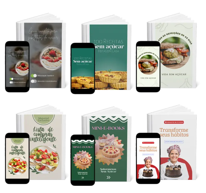• Bolos, tortas, mousses e até aquele pudim clássico… Tudo sem açúcar, mas com sabor de verdade!